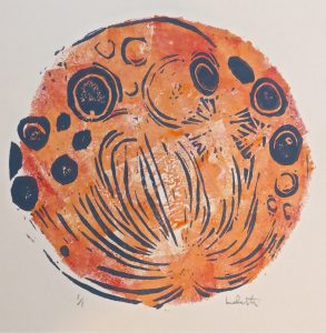 The trees took on a life of their own when I played with stencils filling in the spaces that the tree branches made by rolling ink into the negative spaces with a stencil. The peacock tree was born.