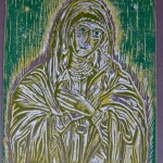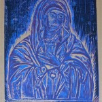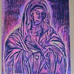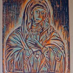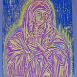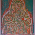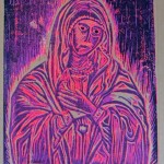 As a printmaker, one of my influences is the silkscreens of Pop artist Andy Warhol. Warhol used bright, complementary colours to make his celebrity portraits vibrate. In my Mary print series, I played with analogous and complementary hues. The ritual of making was also important: more than 450 times, I rolled ink onto Mary’s image and burnished her onto paper. Most of the prints are layered reductions (material from the printing block is carved away between colour applications on a single print); each print contains four or more colours.